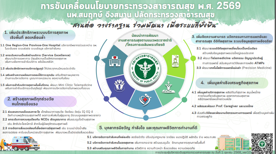 • ยกระดับ อสม.: สนับสนุนการพัฒนาศักยภาพ อสม. เพื่อเป็นผู้ช่วยสาธารณสุข และปรับปรุงสวัสดิการให้มีความยั่งยืน