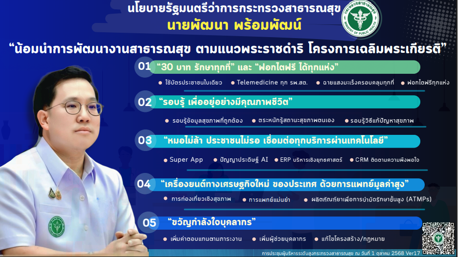 นโยบายของรัฐมนตรีว่าการกระทรวงสาธารณสุขในปัจจุบัน (นายพัฒนา พร้อมพัฒน์) มี 5 ประเด็นหลัก คือ การยกระดับ “30 บาทรักษาทุกที่” ด้วยบัตรประชาชนใบเดียว, การแก้ไขปัญหายาเสพติดอย่างบูรณาการ, การพัฒนาการแพทย์ปฐมภูมิ, การยกระดับเศรษฐกิจสุขภาพ และการเพิ่มการเข้าถึงบริการสุขภาพ นอกจากนี้ ยังมีนโยบายของรัฐมนตรีช่วยว่าการกระทรวงสาธารณสุข (นายวรโชติ สุคนธ์ขจร) ที่เน้นการยกระดับ อสม., การปราบปรามและส่งเสริมความโปร่งใส, และการให้แรงงานต่างด้าวซื้อประกันสุขภาพ